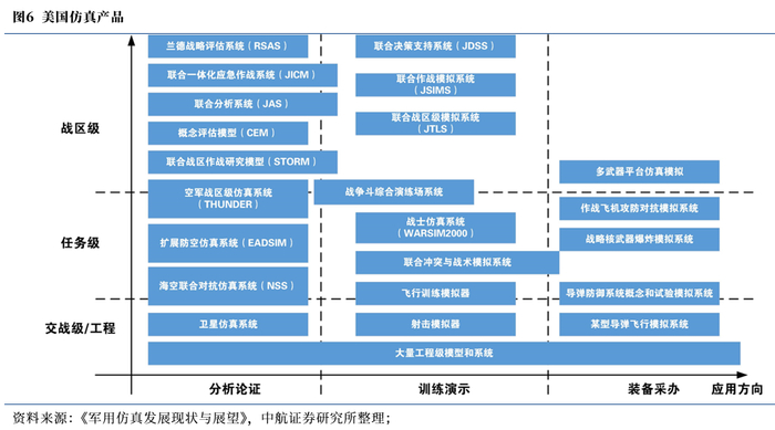 美军构建的众多军事仿真系统由战区/战役级、任务/作战级和工程/交战级三级层次组成,根据适用领域划分,美军使用的典型军事仿真系统有如下几类: