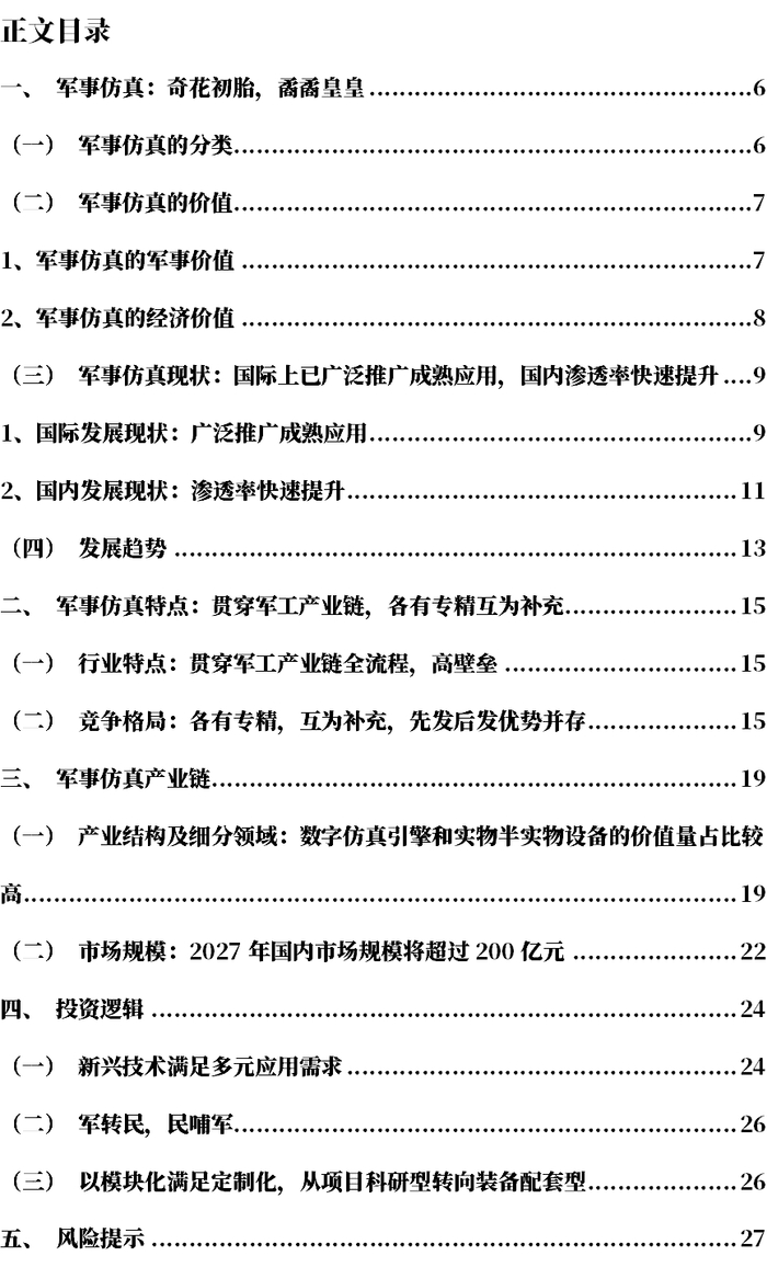 综上,军事仿真作为一个重要的科学技术,在现代科学事业中占有举足轻重的地位,它的广泛应用可以带来巨大的军事价值、经济价值和社会价值。军事仿真是国防现代化背景下的朝阳行业,已经实现了从“0”到“1”的创造性发展,一批具备军事仿真核心技术的专业团队与企业正在快速发展壮大,并逐步为市场所认可,是具备投资价值的前瞻性赛道之一。