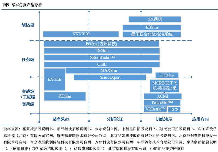 从功能用途及业务领域上划分,军事仿真产品主要由体系架构设计系统、战场空间信息及可视化分析系统、数字仿真引擎(严肃训练游戏)、分析评估系统、实物半实物设备和参试、配试装备等部分组成,其中数字仿真引擎和实物半实物设备的价值量占比较高。各个业务领域差由于用途迥异,估值及增速差异性较大,故各板块业务公司需拆分来研究。