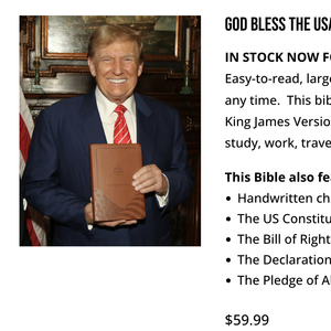 和普通圣经相比,“特朗普联名款“圣经价格高昂,最普通的版本售价也达到了59.99美元,如果是特朗普签名版的圣经,价格则高达1000美元。
