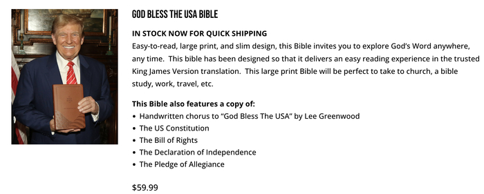 这些圣经在一个网站上独家销售,该网站声称其不隶属于任何政治竞选活动,也不是特朗普拥有或控制的网站。