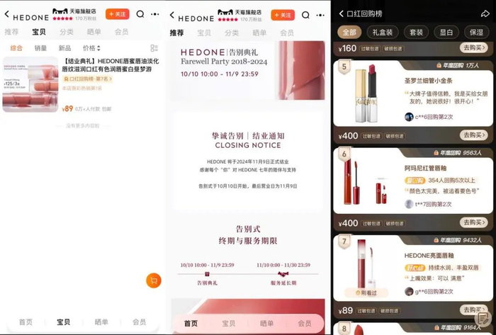 今日(10月10日),青眼获悉,国货新锐彩妆品牌HEDONE宣布其将于11月9日正式终止运营。截至目前,HEDONE品牌天猫官方旗舰店也仅剩下一款唇釉产品在售。这意味着,这个曾获得数轮融资的新锐彩妆品牌即将画上句号。