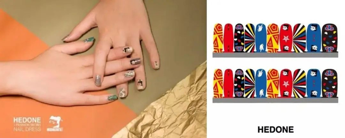青眼注意到,虽然当前HEDONE的主业是彩妆,但在2014年品牌创立伊始,HEDONE的主营业务为美甲相关产品,包括指甲油、甲油贴等等。2016年,HEDONE还与痛痒乐队合作,推出了两波“HEDONE X 痛痒”联名甲贴。