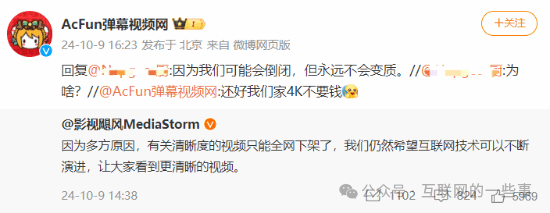 而A站则转发了“影视飓风”的微博,并幽默地表示:“在我们这里,观看4K内容无需额外费用。”同时,还不忘调侃自身现状:“虽然我们面临着经营挑战,但对视频质量的坚持,永远不会妥协。”