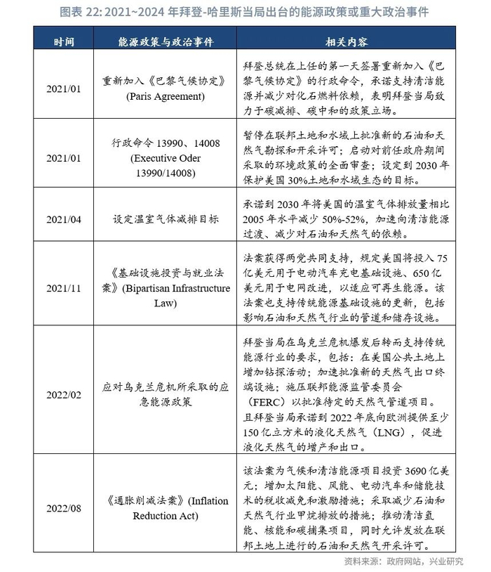 随着美国现任总统拜登于2024年7月21日宣布退出总统大选,现任副总统哈里斯成为民主党总统的热门候选人,并在8月5日正式锁定民主党总统候选人的提名。作为副总统,哈里斯与现任总统拜登紧密合作,在其任上早期推翻了特朗普任期内的一些决策,并通过多项利好清洁能源行业的法案。具体来看,拜登-哈里斯当局采取的能源政策包括:1)支持应对气候变化并推进清洁能源转型,采用减免税收等激励方式鼓励清洁行业发展;2)加强对传统能源行业的监管,初期停止发放新的石油和天然气开采许可,乌克兰危机后放宽对新建设油井/天然气井的监管;3)运用财政手段和政府投资,加大对清洁能源转型和可持续能源科技研发的支持力度。