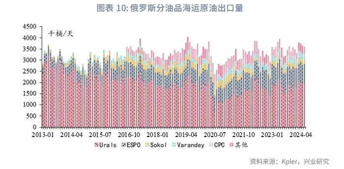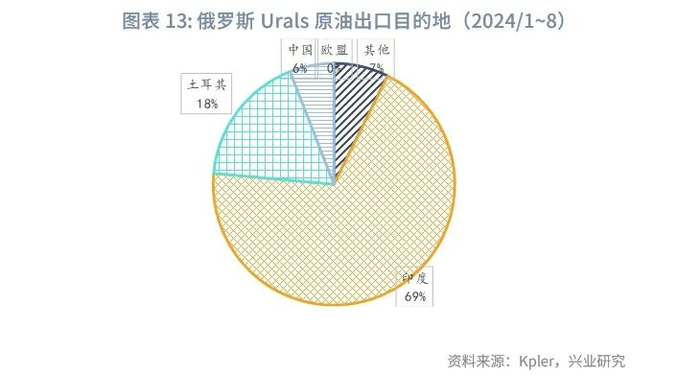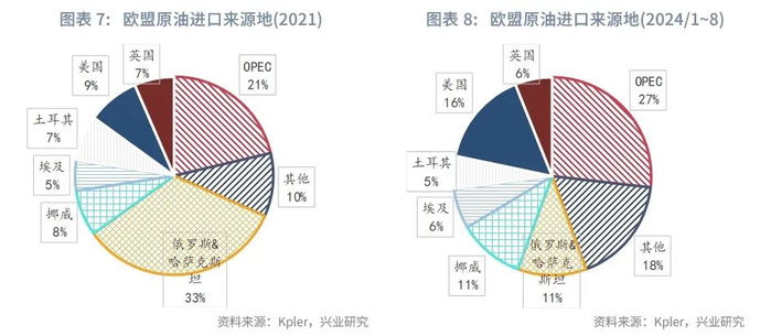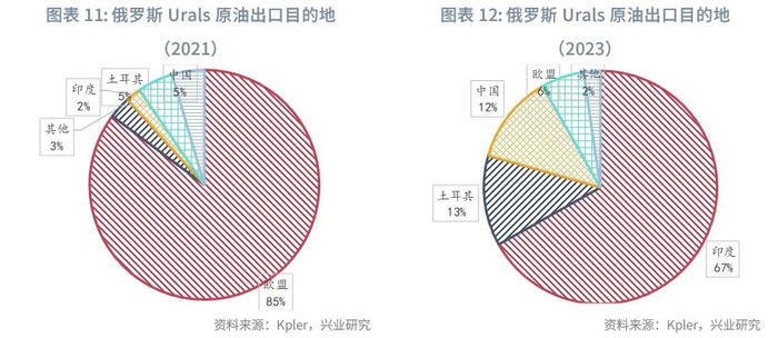 2022年以来俄罗斯原油出口总量基本稳定,出口目的地出现了显著东移。乌拉尔原油(Urals)以及ESPO原油是俄罗斯海运出口量最大的两个油种。乌克兰危机之前,2021年俄罗斯乌拉尔原油向欧盟出口占其乌拉尔原油出口总量的85%,这一比例2023年降至6%,2024年至今更是进一步降至0。相对应的,印度自俄罗斯进口的乌拉尔原油进口占比从2021年的2%上升至2023年的67%,2024年至今这一占比升至69%。ESPO在乌克兰危机前后,主要目的地都是中国,占据80%以上的绝对权重,量级变化不大。不过俄罗斯通过Druzhba管道向欧洲输送的原油量在2023年出现骤降,由乌克兰危机前的80万桶/天降至约30万桶/天(截至2024年2月的数据),对应着2023年俄罗斯自愿加深减产的50万桶/天。从OECD(经合组织)欧洲国家进口端来看,俄罗斯进口的原油量占经合组织欧洲国家总需求量的比例从2022年第二季度的23.3%快速下降至2023年第三季度的6.3%,欧洲对俄原油依赖度降至历史低点,欧盟核心国家针对能源供应链的“去风险化”措施是对俄原油依赖度下降的根本原因。