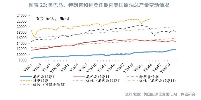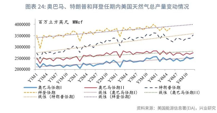回顾历史来看,在过去四轮美国总统任期内,无论是由民主党总统或者共和党总统主政,原油与天然气开采量都在稳步上升。相对而言,民主党总统奥巴马、拜登任期内油气产量增速低于共和党总统特朗普,但总的增产趋势不受两党选情左右。