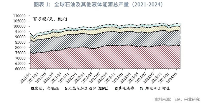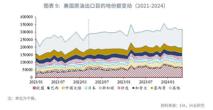 原油方面来看,2022至2024上半年全球原油产量总体保持稳步增长态势。但从结构来看,乌克兰危机爆发后,俄罗斯原油产量占世界总产量的比例从2022Q1的11.64%下降至2023Q4的10.62%。相较而言,美国原油供应的重要性持续上升,美原油产量占比从2022Q1的19.2%上升至2023Q4的21.44%。从出口量数据来看,美国原油和石油产品总出口量从2022Q1的771.1万桶/天增长到2024Q1的1058.8万桶/天,累计涨幅37.3%;美原油出口量(不含石油产品)增长更迅速,从2022Q1的281.5万桶/天增长到2024Q1的424.5万桶/天,累计涨幅达50.79%,而同一时期美国原油进口量基本持平,石油产品进口量小幅下滑,体现乌克兰危机后国际原油贸易中“美升俄降”的趋势。
