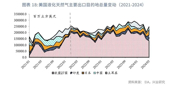 相较之下,乌克兰危机爆发后,美国天然气产量和出口量均出现提升。2022Q1至2024Q1,美国天然气开采量增长8.69%,出口量增长10.52%。其中,以“欧盟27国+英国”为目的地的美国液化天然气出口份额从2021年28%,跃升到2023年的62%,增幅超过100%;在此期间,美国对中国以及其他新兴经济体(如智利、巴西)LNG出口量快速下降。具体来看,美国液化天然气对法国、西班牙等国的出口有所增加,而荷兰、德国等传统上更依赖俄罗斯能源的欧盟国家也在2023年起大幅增加美产液化天然气的进口量,表明欧盟国家正在用美产液化天然气替代俄产管道天然气,驱动“美升俄降”能源格局的形成。
