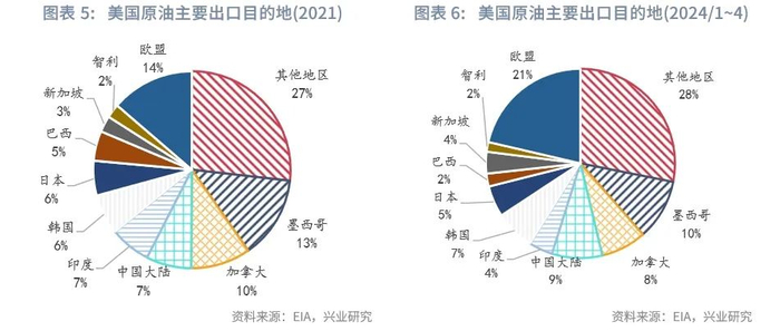 美国原油出口结构在乌克兰危机后向欧盟倾斜:2021年仅有14%的美国原油出口份额目的地为欧盟地区,2024年前五个月,约21%的美国原油出口份额目的地为欧盟,对欧盟出口份额三年累计增长超过50%;美国原油对新兴经济体(包括印度、巴西、智利、墨西哥)出口相对份额则在2021至2024年初逐步减少。根据美国能源信息署公布的数据,美国出口至西班牙、德国、荷兰的原油及石油产品总量,2022Q1至2024Q1的增幅分别为67.71%、57.45%以及131.90%,表明美国对欧盟国家出口的增加可能是导致“美升俄降”趋势的关键因素。此外,欧盟也加大了从OPEC进口原油的比例,从2021年233.4万桶/天提升至320.2万桶/天,进口占比从21%提升至27%,说明欧盟寻求能源来源多元化。