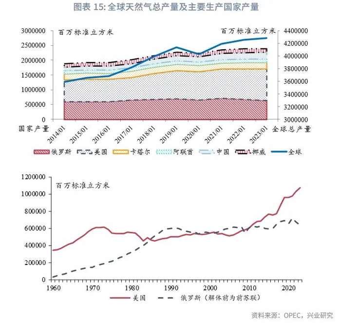 天然气方面来看,乌克兰危机前后,全球天然气生产和消费总量保持稳定增长;但从结构看,2022至2023年,在其他主要生产国市场份额稳定的情况下,美国天然气开采量稳步上升,而俄罗斯天然气开采量以及全球市场份额有所下降,说明天然气供应格局也存在“美升俄降”的趋势。