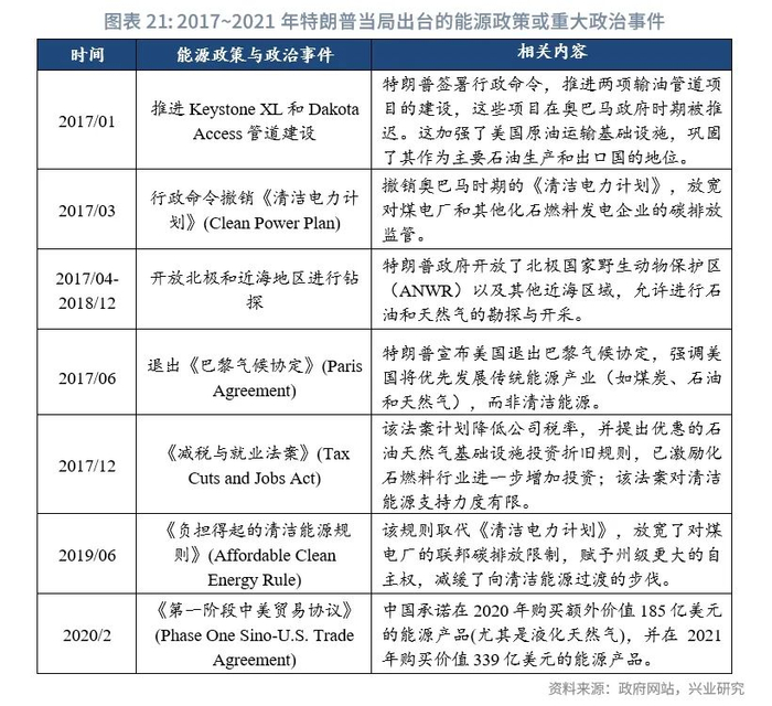 回顾特朗普上一任期内的能源相关政策,可以发现特朗普明显支持传统能源行业,推翻了前任民主党总统奥巴马的部分清洁能源政策。具体来看,特朗普当局主要采取的手段有:1)放宽对传统能源行业的碳排放监管,并允许传统行业降低环境与生态保护标准,如在北极生态保护区进行原油勘探和开采等;2)以行政手段推动美国国内传统能源开采、加工、储存和运输设施的投资建设,加强原油管道建设和液化天然气生产与加注设施建设等等;3)运用财政手段,以优惠的税收和政府补贴政策激励传统能源行业发展;4)以“美国优先”为准绳展开“重商主义”式外交,积极推动美国传统能源出口至亚洲和欧洲,以天然气为“战略工具”与其他能源大国(如俄罗斯)进行地缘政治竞争,最大化美国政治经济收益。