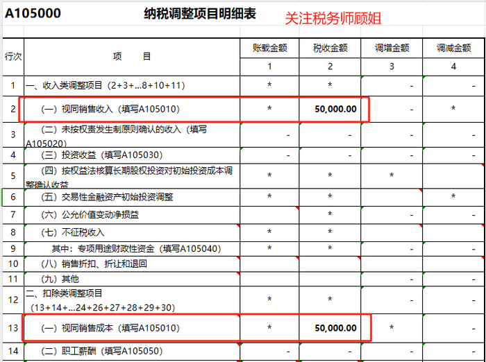 这里由于视同销售收入和视同销售成本是一样的,最终不影响纳税调整额,但数据还是要填报的,因为业务招待费、广告宣传费的基数是含着视同销售收入的,填写完整对企业是有利的。