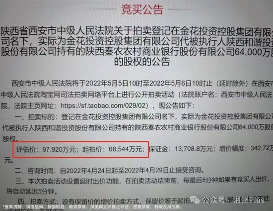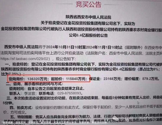 司法拍卖平台显示,秦农银行6.4亿股即将拍卖,起拍价为11.58亿元,相当于1.81元/股。此次拍卖并未公布评估价,而是采取定向询价的方式进行估值,市场价为13.63亿元。值得注意的是,这笔股权属于违规代持,虽登记在金花投资控股集团名下,实际是陕西和谐投资股份有限公司(以下简称陕西和谐投资)所有。