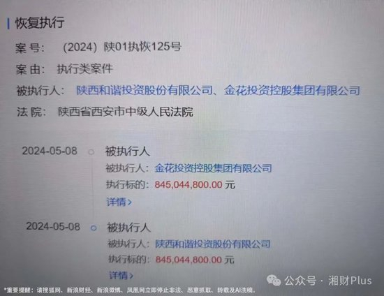 湘财Plus注意到,陕西和谐投资于2024年5月被列为被执行人,申请执行人为国民信托有限公司,被执行人为陕西和谐投资、金花集团,执行标的为8.45亿元,此次为恢复执行。执行关联案件显示,此案案由为借款合同纠纷。