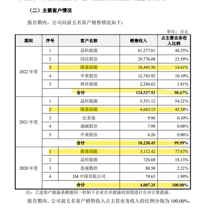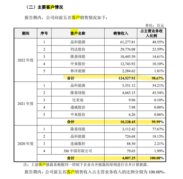 报告期内,公司前五大客户主营业务收入合计占比分别为 100.00%、99.99%和98.67%,主要客户集中度相对较高。一方面是因为光伏电池片制造行业集中度较高,2022 年中国前五大电池片厂商的产量占总产量的 56.30%1。另一方面,是因为新型高效光伏电池片的产业化尚处于起步阶段,各光伏电池片厂商因为产能建设规划、产品工艺开发进程等方面存在一定差异,相关设备采购进度存在差异。