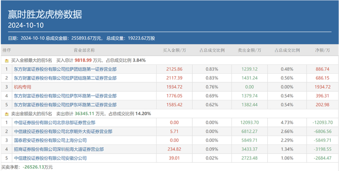 10月10日,呼家楼的常用席位一共出现在6只个股盘后披露的龙虎榜单上,其中3只个股为净卖出,合计的净卖出金额高达8.86亿元,另外3只个股为净买入,不过其中仅1只个股的净买入金额超过了1亿元。