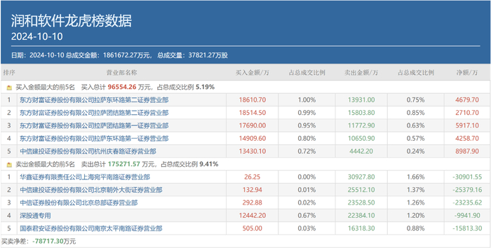 具体来看,20CM跌停的润和软件(300339.SZ)首当其冲,龙虎榜数据显示,当日呼家楼的两大常用席位中信建投证券北京朝外大街和中信证券北京总部分别出现在该股卖方第二和第三位,卖出金额分别为2.55亿元和2.35亿元,合计占该股当日总成交额的比例为2.63%。