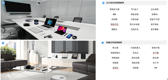 办公场景:智能显示器、智能会议系统、AR/VR/MR、智能音箱、笔记本电脑、控制器、平板电脑、智能手机、无线充电及安防摄像头等。