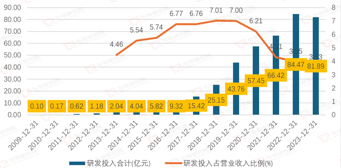 2009-2016年公司研发投入持续增长,由2009年0.1亿元增长至9.32亿元,2017至2022年由15.42亿元大幅增长84.47亿元,2023年略微下降至81.89亿元。研发投入占营收比例由2013年4.46%增长至2019年7%,2020-2023研发投入占比降低,分别为6.21%、4.31%、3.95%、3.53%。