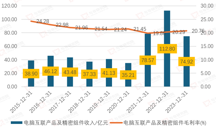 2015-2020年公司电脑互联产品营收变化不大,由2016年46.12亿元下降至2020年35.21亿元,2021-2022年爆发式增长至78.57亿元、112.80亿元,2023年下降至74.92亿元。毛利率由2015年24.28%下降至2023年20.29%。