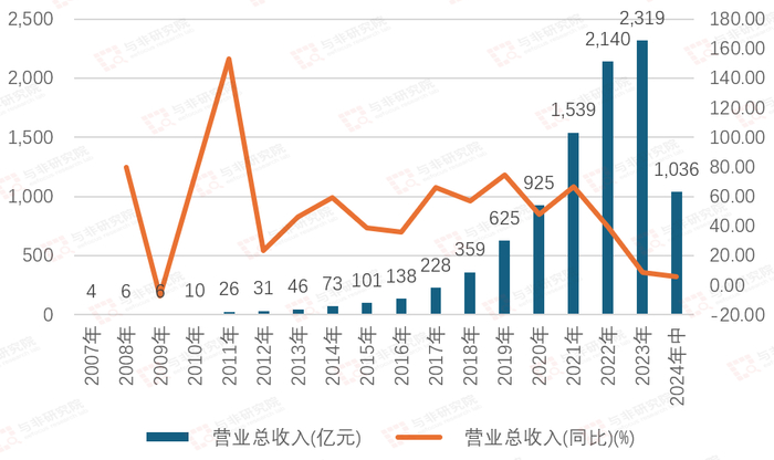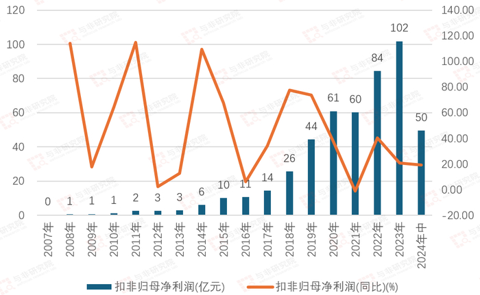 2008-2014年公司扣非净利润由1亿元增长至6亿元,2015年首次跨越10亿关口,2015-2023年由10亿元增长至102亿元,2024H1实现扣非归母净利润 50 亿元,同比增长 24%。年复合增速47.77%。
