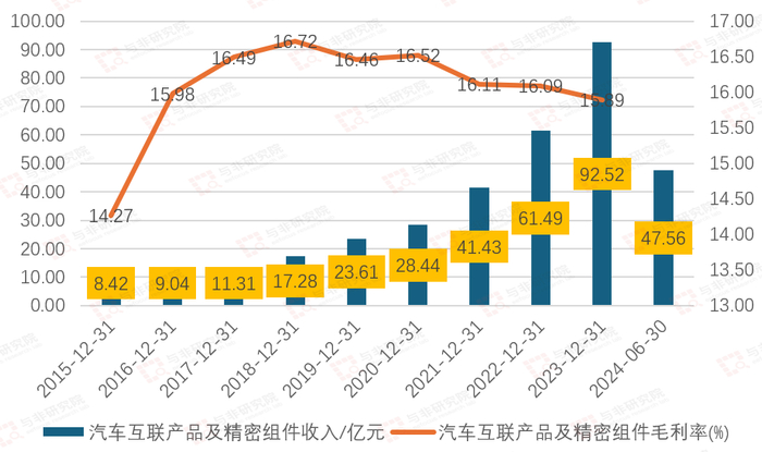 2015-2023年,汽车互联产品收入持续增长,由2015年8.42亿元增长至2023年92.52亿元,2024H1为47.56亿元。2015-2018年产品毛利率持续上升,由14.27%提升至16.72%,2019-2023年持续下降,由16.46%降低至15.89%。