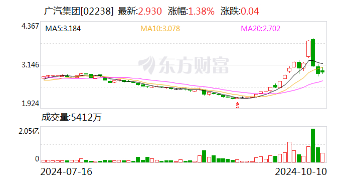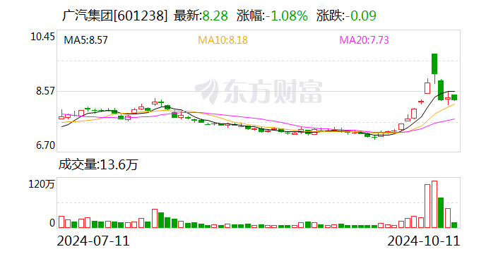 受政策利好提振,股市迎来大涨,广汽集团股价也迅速走高,公司市值从近期低点的略超700亿元,一路涨至国庆节后最高的逾千亿元,涨幅超过40%。近两日回调后,市值也有850亿元左右。