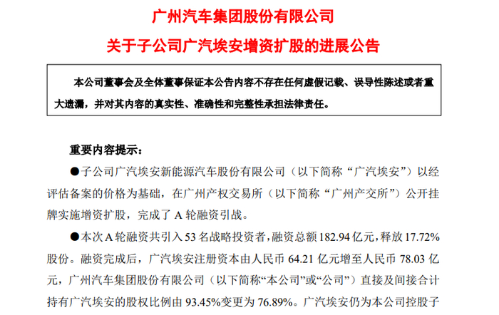 53名战略投资者增资182.94亿元,为当年国内新能源整车单笔最大私募融资。A轮融资完成后,广汽集团持股降至76.89%。53名战略投资者获得17.72%的股份。广汽埃安投后估值超千亿元,达到1032亿元。