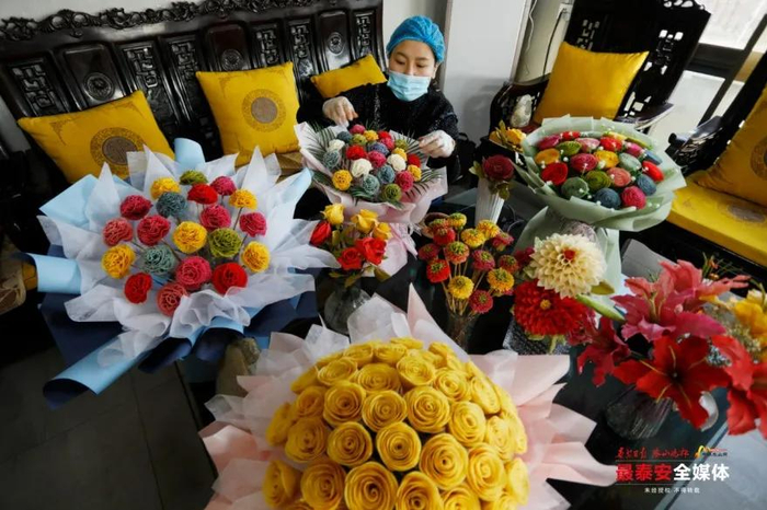 在新泰市楼德镇,“80后”创业者用一双巧手将普通的煎饼变成了五颜六色、形象逼真的花朵,将煎饼做出了新花样,煎饼的种类越来越多。