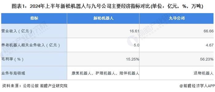 新松机器人和九号公司是中国养老机器人行业代表性上市公司。从业务收入来看,新松机器人2024年上半年养老机器人相关业务收入约5亿元,高于九号公司;从毛利率来看,新松机器人2024年上半年毛利率约15.25%,九号公司为56.23%。