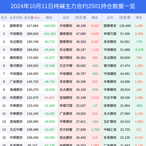 新浪期货 根据交易所数据,截至10月11日15点收盘主力合约纯碱2501,涨跌+1.81%,成交量242.67万手,持仓数据显示前20席位呈现净空,差额头寸为150143手。