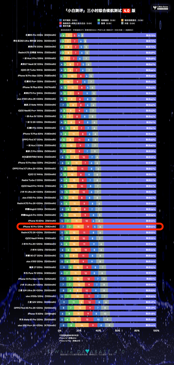 大家催更的iPhone 16 Pro续航测试成绩来了,数据库4.0续航模型实测表现如下: