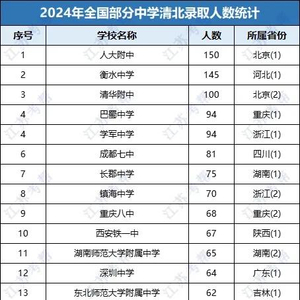 下表统计了2024年全国部分中学清北录取人数,北京人大附中、清华附中、河北衡水三校人数超一百,鼎鼎有名的重庆巴蜀中学、浙江学军、镇海等录取人数也非常多,这主要也因为南外的主要升学目标是国外高校,不然清北数肯定更多。