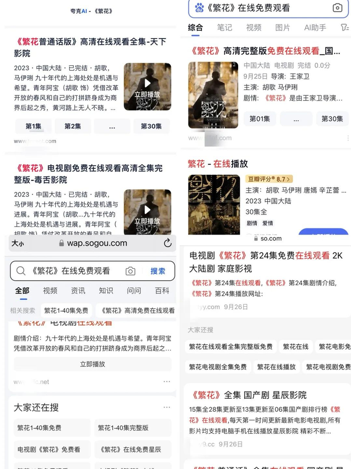 当记者在百度、搜狗、360搜索等在内的多家搜索平台输入“《繁花》在线观看”后,搜索结果的第一页均有显示盗版视频网站,有些盗版侵权网站的搜索结果显示顺序甚至排在正版链接的前面。