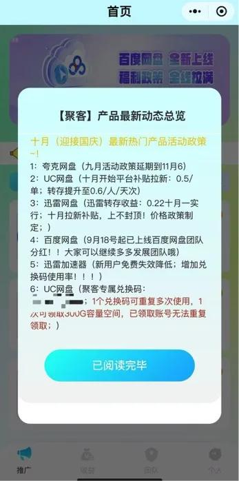记者搜索“聚客koc”小程序发现,这是一个引导用户参与“网盘拉新”的"网推聚合平台",宣称参与者在分享影视剧资源网盘链接后,若吸引用户转存或完成用户拉新就可获得收益、进行提现。