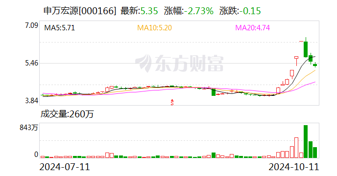 申万宏源10月11日大宗交易平台出现一笔成交,成交量40.00万股,成交金额214.00万元,大宗交易成交价为5.35元。该笔交易的买方营业部为机构专用,卖方营业部为中信证券股份有限公司上海分公司。
