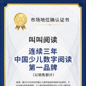近日,叫叫阅读获得由咨询机构CIC灼识咨询授予的“连续三年中国少儿数字阅读第一品牌”市场地位认证书。灼识咨询基于对中国少儿数字阅读市场的行业研究,以2021-2023年全渠道销售额进行排名,作为相关认证工作数据来源。