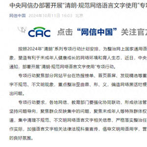 10月11日,网信中国发文,按照2024年“清朗”系列专项行动计划安排,为整治网上国家通用语言文字不规范使用乱象,塑造有利于未成年人健康成长的网络环境和育人生态,近日,中央网信办、教育部印发通知,部署开展“清朗·规范网络语言文字使用”专项行动。