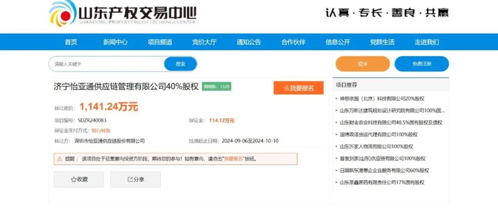 立刻财经注意到,9月6日,济宁怡亚通40%股权在山东产权交易中心挂牌出售,转让方为上市公司怡亚通。