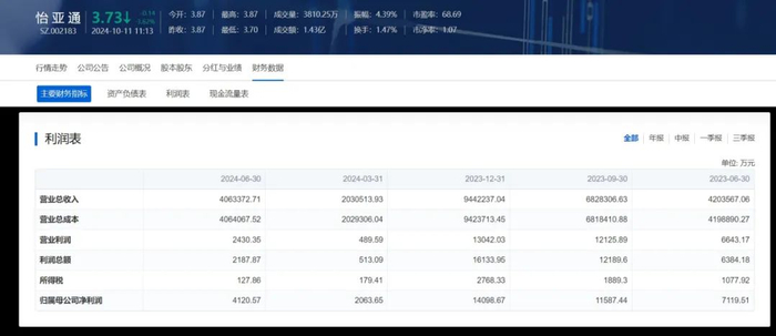 近年来,尽管怡亚通做了多种尝试探索其他领域业务,但利润却不升反降。2024年年中报数据显示,上半年怡亚通实现营业收入406.34亿元,同比下降3.34%;实现净利润4120.57万元,同比下降42.12%。
