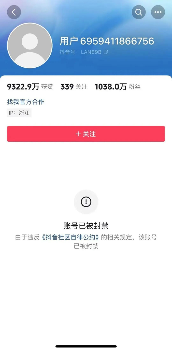 在此次被封禁前,今年5月,“大蓝”的账号直播功能也曾被封禁了30天,随后账号更因违反社区规定被禁止关注了一段时间。