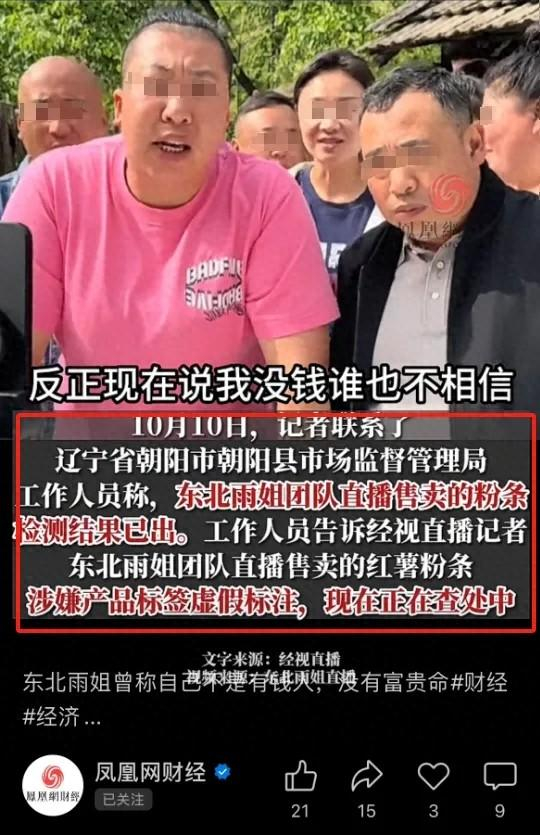 10月10日,辽宁朝阳县市场监督管理局回应,东北雨姐团队直播售卖的红薯粉条,检测结果已出,确实涉嫌产品标签虚假标注,现在正在查处中。也就是卖假货的行为,基本被证实了。