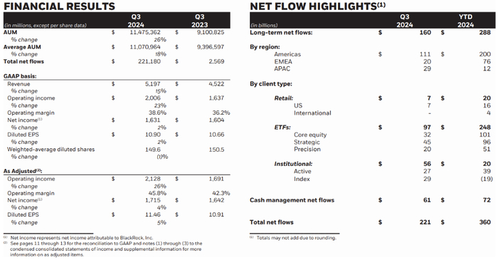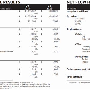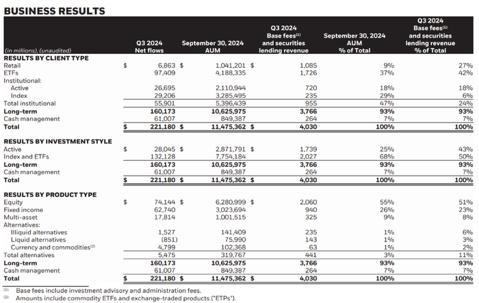 - 第三季度管理资产总额(AUM):11.48万亿美元,高于预期11.19万亿美元,主要得益于净流入和市场的积极走势;