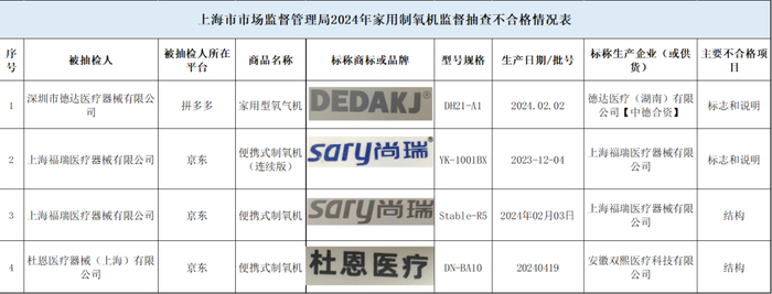 针对消费者投诉、举报集中及质量问题较多的产品,近期,市市场监管局集中组织力量对浦东、杨浦、宝山3个区域以及京东、拼多多、天猫3个网络平台10家企业销售的11个品牌15批次家用制氧机进行监督抽查。经检验,有4批次不合格,不合格检出率为26.7%。检测项目涉及对触及带电部件的防护、发热、工作温度下的泄漏电流和电气强度等28项。本次抽查不合格项目为结构、标志和说明2项,均为国家强制性标准。详见↓