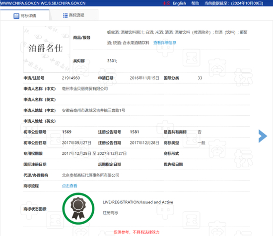 经查询,“泊爵名仕”是一个在2016年11月15日提交注册申请的酒类商标,并于2017年12月28日获准注册公告,商标持有人为亳州市金贝丽商贸有限公司。