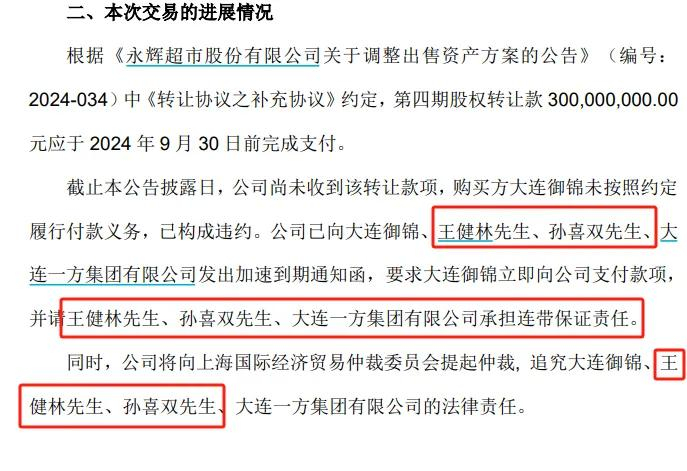 永辉超市已向大连御锦及担保方王健林、孙喜双、大连一方集团发出加速到期通知函,要求立即支付款项,并承担连带保证责任。同时,公司将向上海国际经济贸易仲裁委员会提起仲裁,以追究其法律责任。此次股权转让协议存在无法及时履约的风险,公司将根据规定及时披露进展情况,提醒投资者注意风险。
