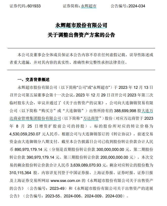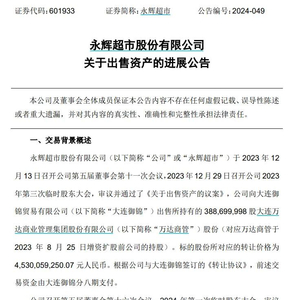 永辉超市公告称,考虑到大连御锦存在短期资金周转困难,公司调整了股权出售的付款方案,转让款支付期数从八期调整为十期,其中第三期股权款项由7.92亿元变为2亿元,并延长全部转让款的最终付款期限至2026年3月31日,同时补充万达集团董事长王健林做担保。