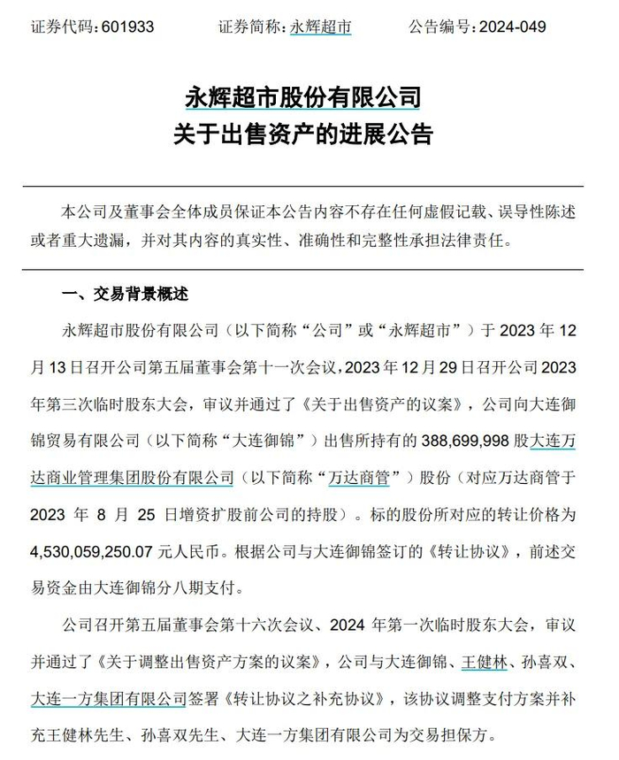 随后7月份,永辉超市通过了《关于调整出售资产方案的议案》,与大连御锦、王健林、孙喜双、一方集团签署《转让协议之补充协议》,该协议调整支付方案,并补充王健林、孙喜双、大连一方为交易担保方。