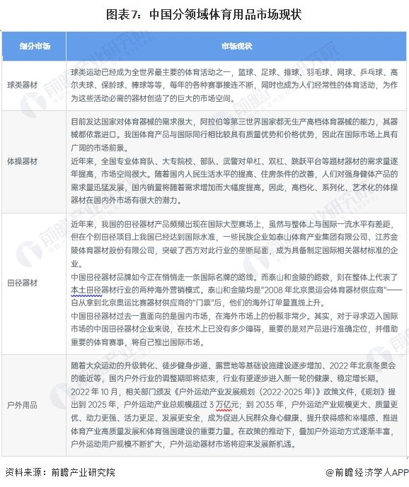 体育用品涵盖范围较广,主要包括球类器材、体操器材、田径器材、户外器材以及其他一些用品等,每个领域市场现状发展不一: